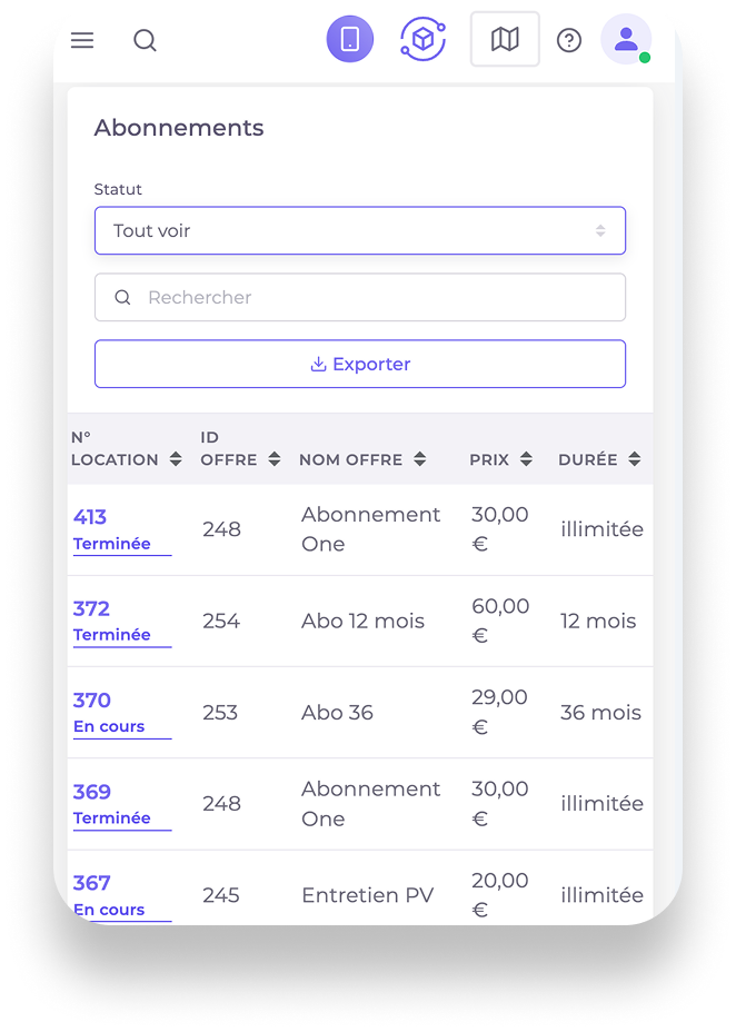 Une fois le paiement validé, l’abonnement est actif. L’interface affiche alors un indicateur spécifique (R pour récurrent), permettant de distinguer facilement ces locations des autres.